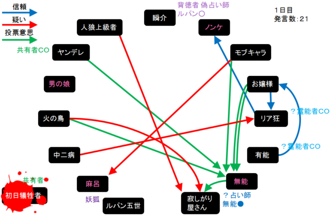 瞬介「無能(人狼)が処刑をされた。投票結果から人狼を特定できないぞ。ルパン(俺の○)を信頼した麻呂が人狼かあ?」