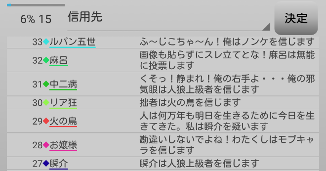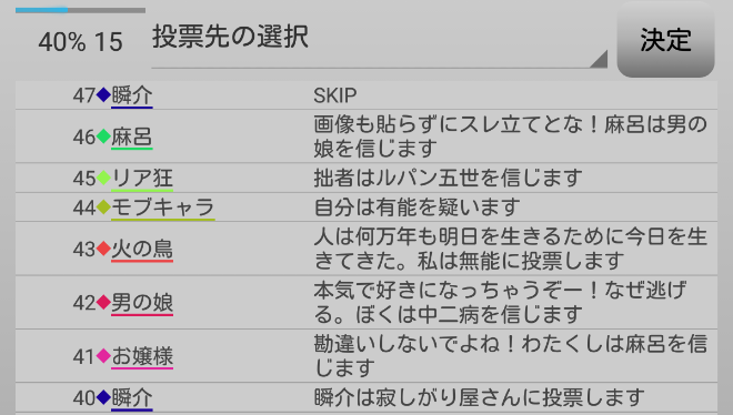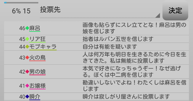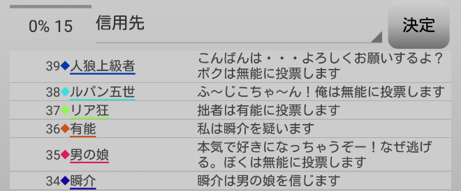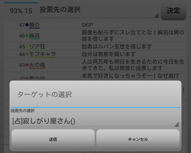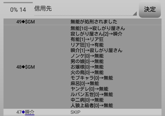 瞬介「ほぼ全員が無能に投票をするようだ。対抗の●に投票するやつを信頼してもしょうがない。俺は対抗占い師の『寂しがり屋さんへ投票します!』」