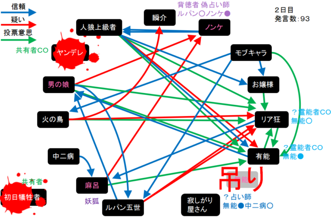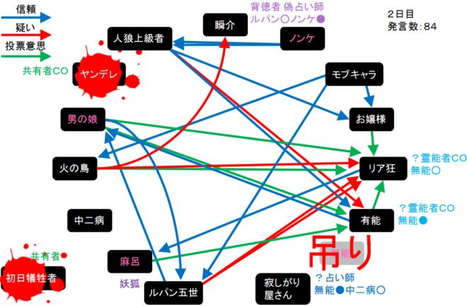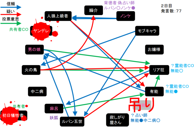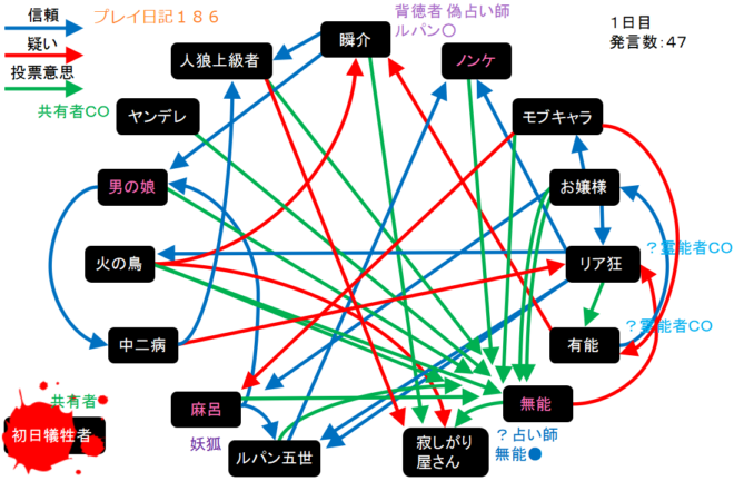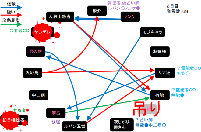 瞬介「上の図を見ると麻呂(人狼候補)が男の娘(人狼候補)へ信頼発言を飛ばしている。『序盤に人狼は人狼を信頼しないよ』の法則(妄想)から人狼の配役は『ノンケ●、麻呂?●、男の娘?●』となる。ノンケ!お前に●を出すぞ!出すぞ!」