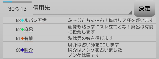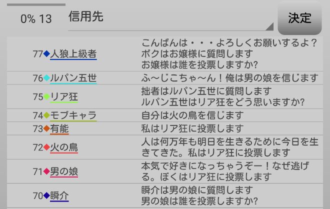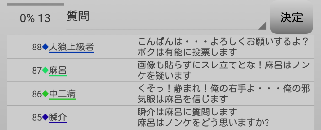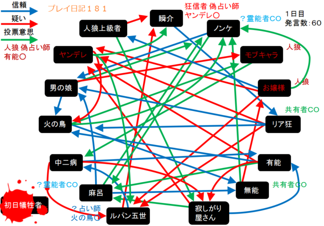 瞬介「人狼同士で信頼関係を築くと怪しまれるからだね(妄想)。過去のゲームでも序盤に人狼が人狼を信頼することは無かったと思う(妄想)。以上を踏まえて昨日の発言表(下の図)を見てみよう」