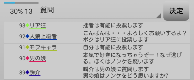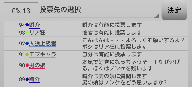 瞬介「共有者がいないせいか票がまとまらない。ノンケ処刑は諦めた方が良いかもな。せめて男の娘が人狼なのか否かを知りたい!何度も男の娘に投票先を質問しよう。『男の娘は誰に投票をしますか?』」