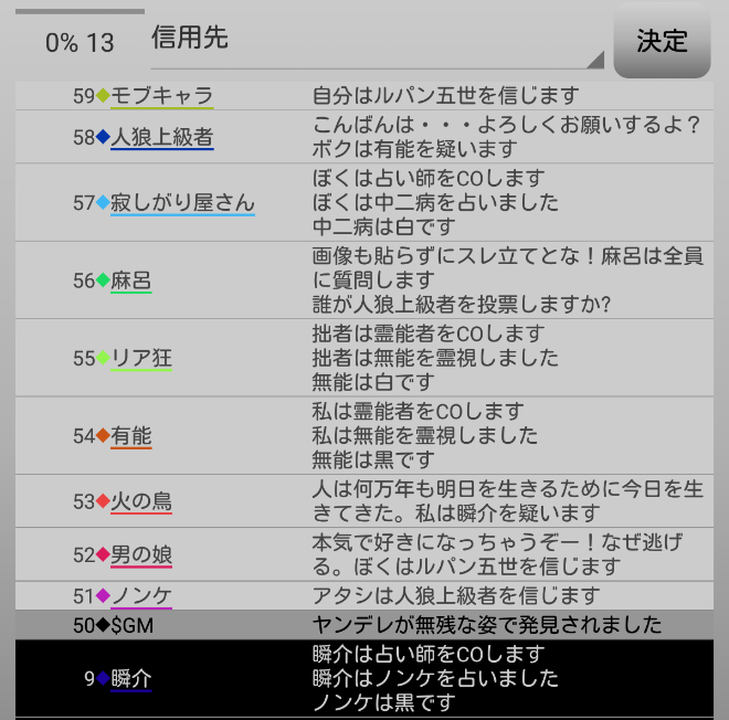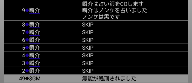 瞬介「ノンケが村陣営だったら中盤までに人狼を駆逐することができない。終盤に妖狐ルパンを呪殺されて敗北するだろう。占い結果を発表します!『ノンケを占って●でした!』」