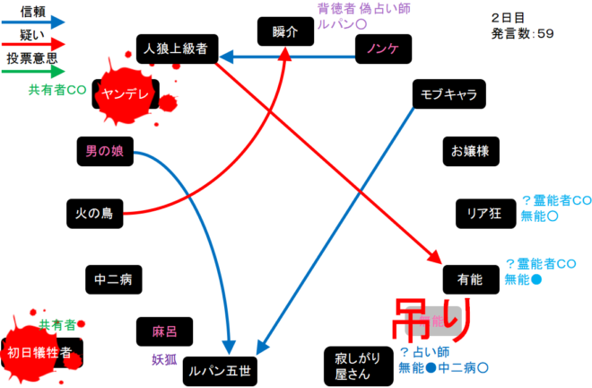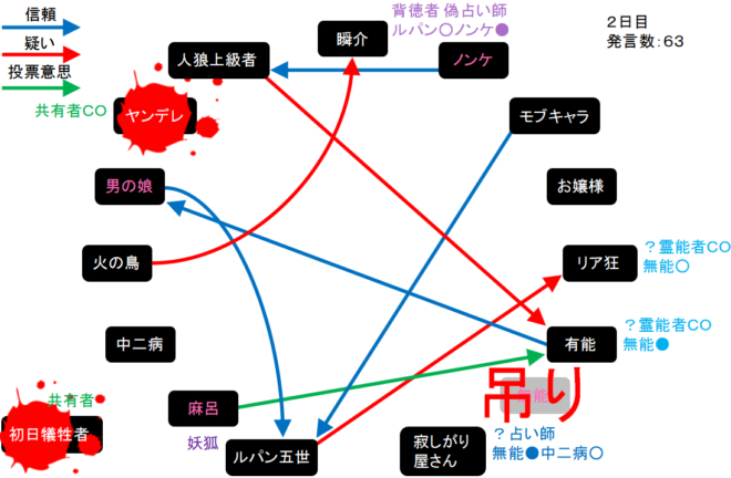 真霊能者に投票をする麻呂が人狼?配役は『ノンケ●、麻呂●、男の娘○』なのか?それともノンケが○で男の娘が人狼!?