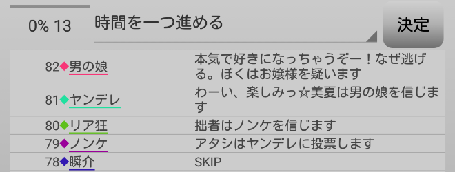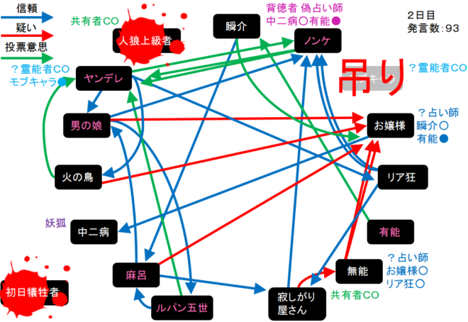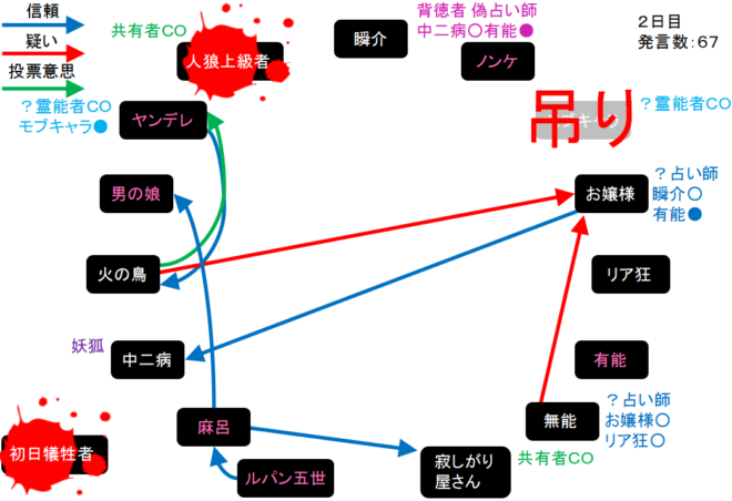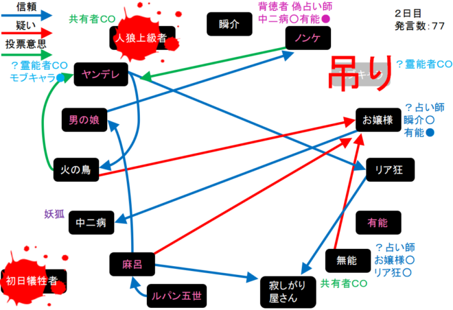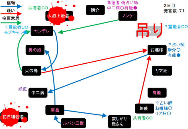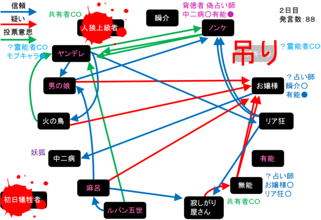 人狼はヤンデレを切り捨てるだろうな。結果、人狼の配役をつかめないまま3日目に突入する。
