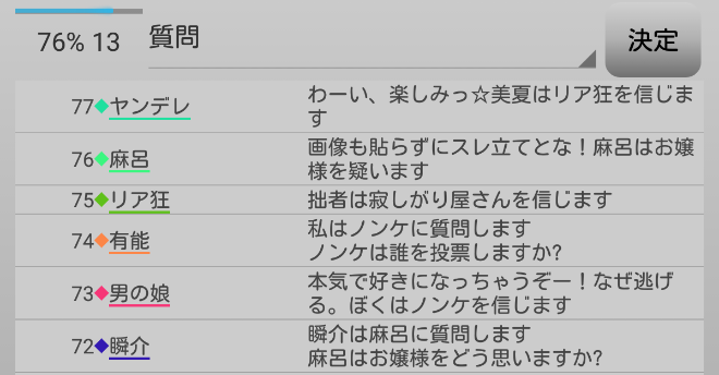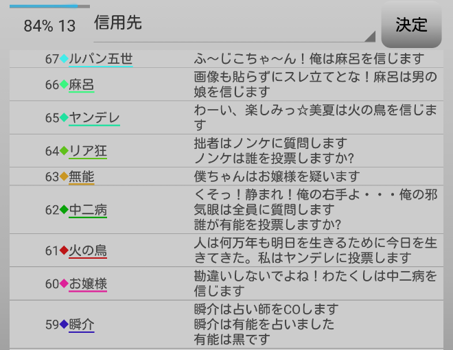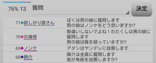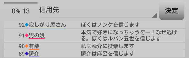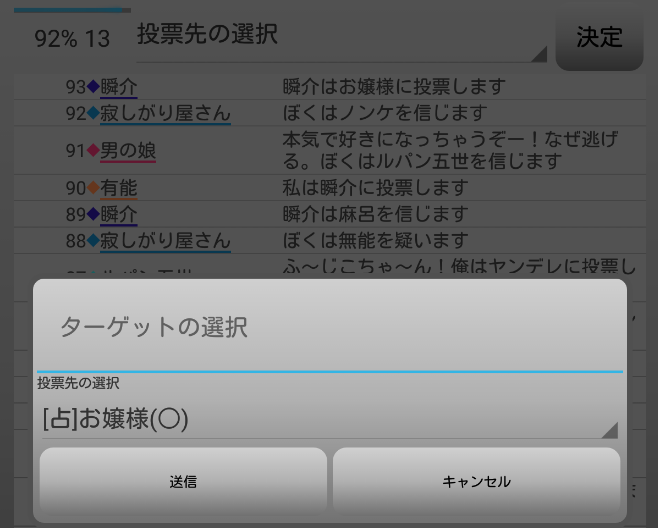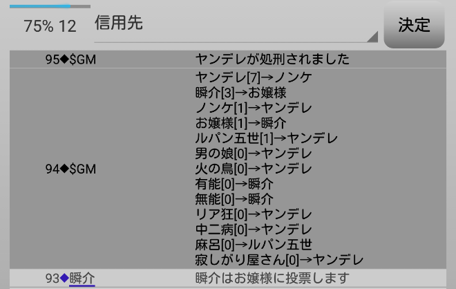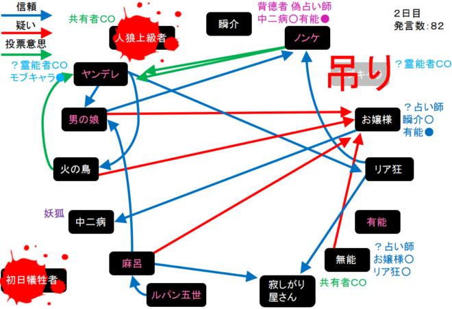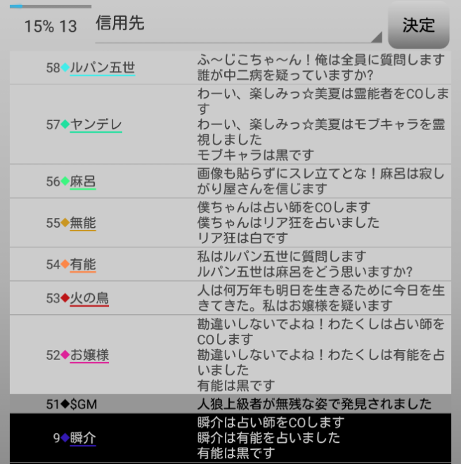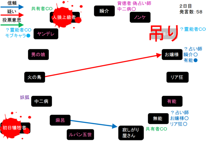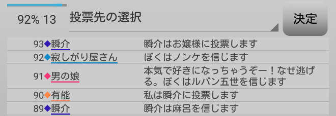最後の発言になります。俺は真占い師っぽい『お嬢様に投票をします!』」。