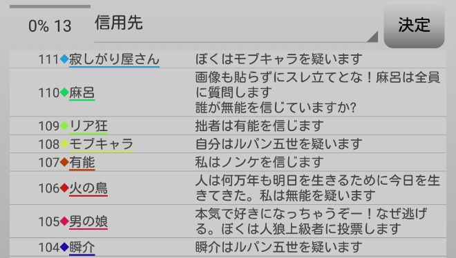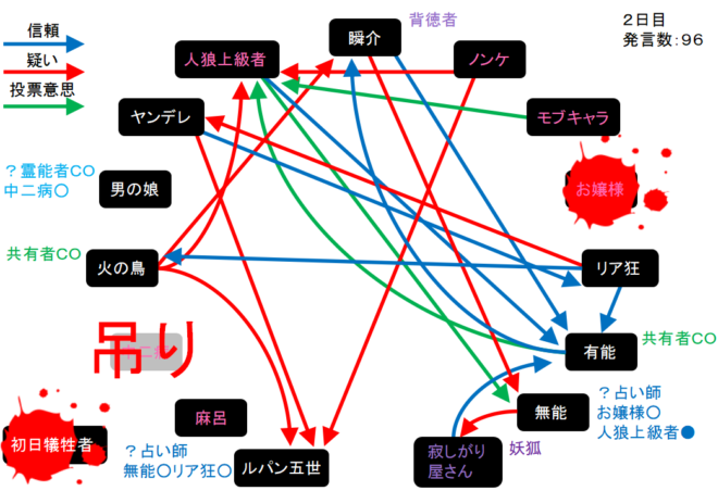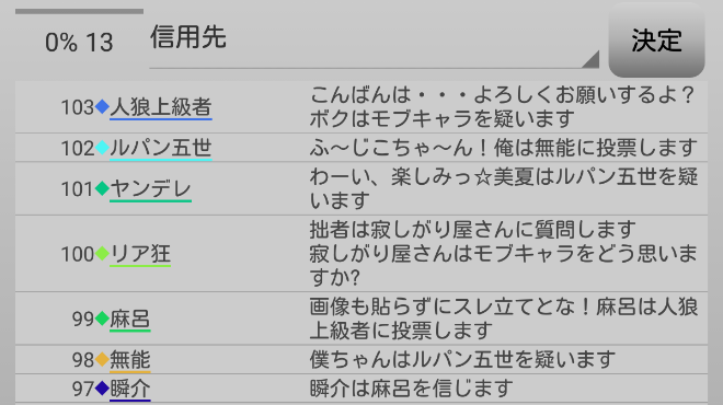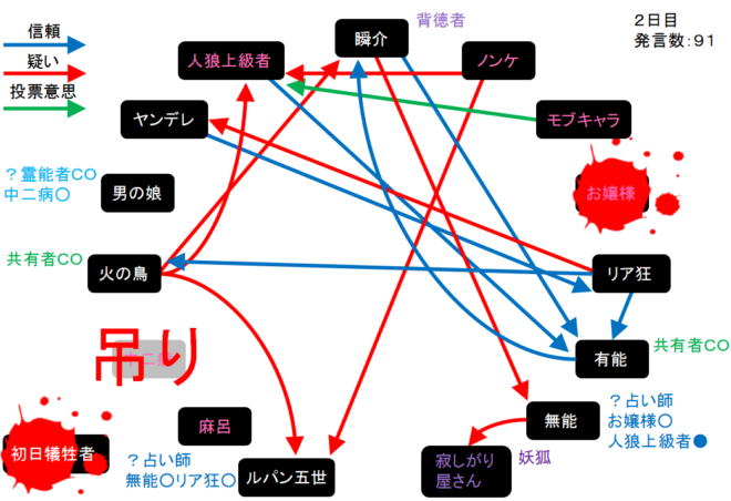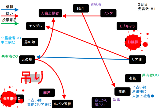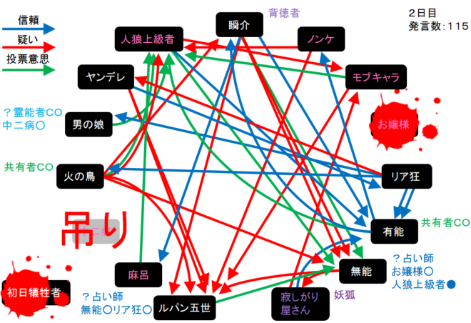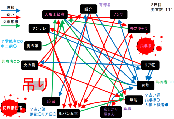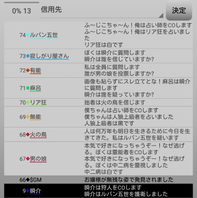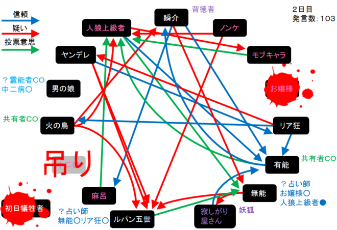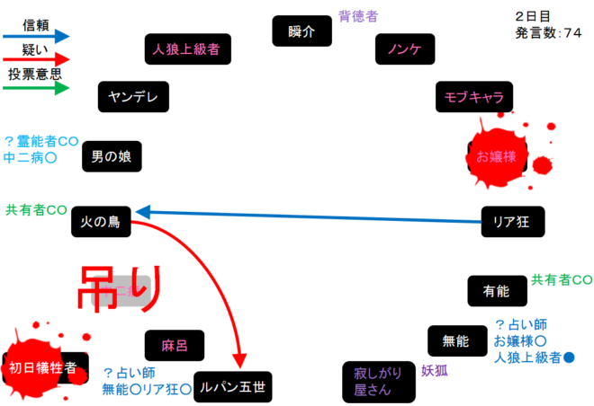 占い結果は無能が人狼上級者●、ルパンがリア狂○を提示した。『人狼上級者、ノンケ、モブキャラ、麻呂』の中に人狼は3匹。無能は真占い師だと思う。