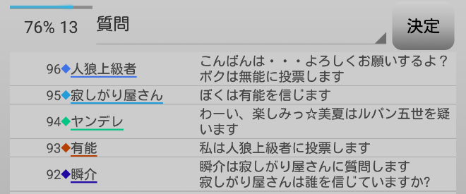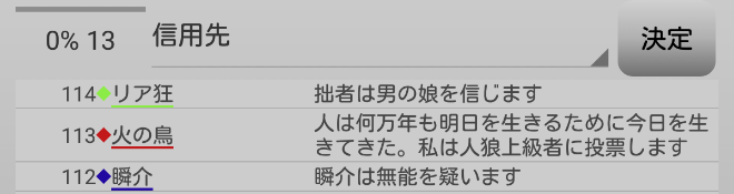 最後の発言になります。皆は人狼上級者へ投票をしています。俺は占い師の『無能へ投票をします!』。