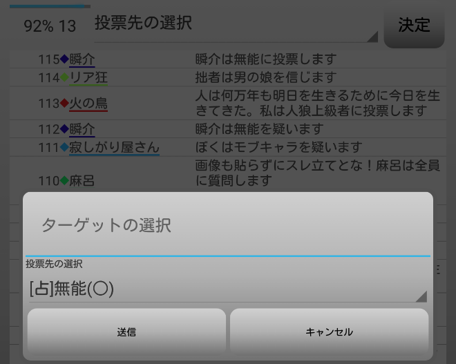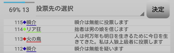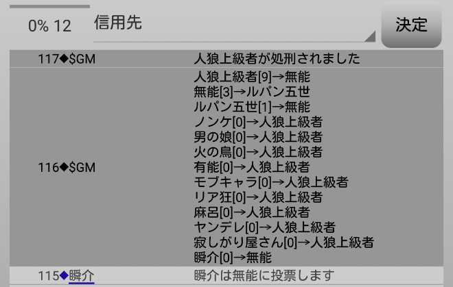 瞬介「議論はこれで終わり。投票の時間になります。占い師を挑発しすぎたかも。明日、グレランになったら死ぬぞ。『無能に投票をします』」