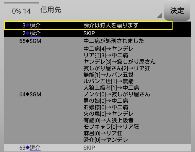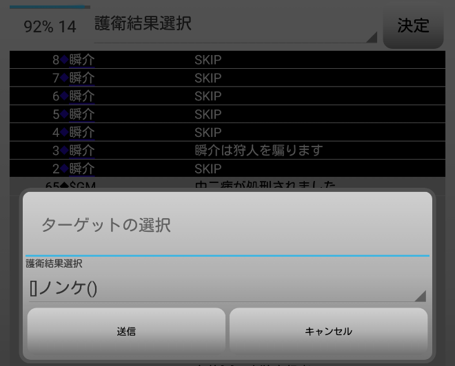 瞬介「うわっ!びっくりした!護衛先の選択がでた(上の図)。偽狩人をやる度にびっくりしているな。占い師のルパンを護衛しておこう」
