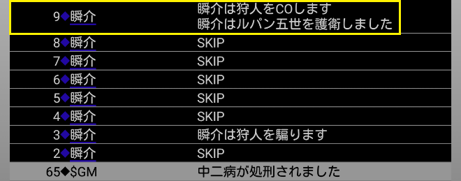 瞬介「狩人COの準備をした(上の図)。●を出されて無慈悲に処刑されるのは嫌だからね」