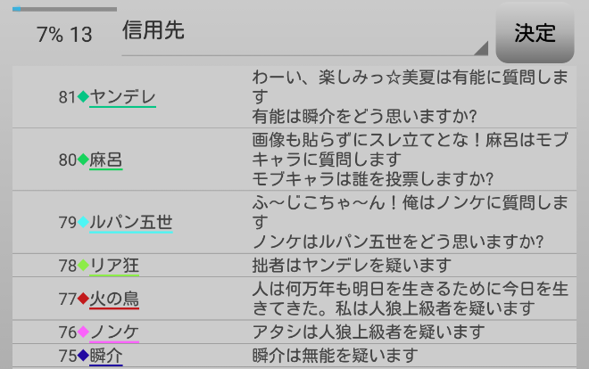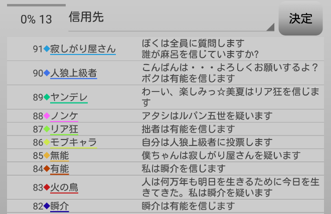 俺よりも寂しがり屋さんの方がピンチだろう。真占い師(?)の無能から疑われている。寂しがり屋さん!もっと発言をしなよ!『寂しがり屋さんは誰を信頼していますか?』。