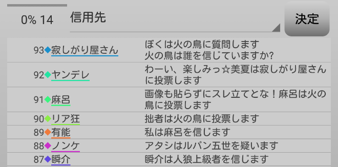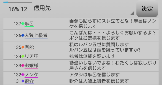 信頼関係を構築しながら様子をみよう。俺は『人狼上級者を信頼します!』」