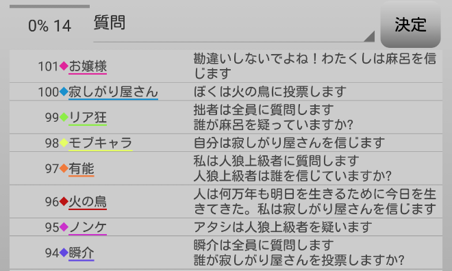 さてどうする?ヤンデレの他に妖狐へ投票するプレイヤーがいるかもしれない。念のために質問をしておこう。全員に質問をします!『誰か寂しがり屋さんに投票する人はいますか?』。