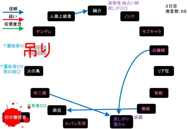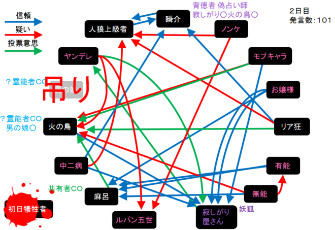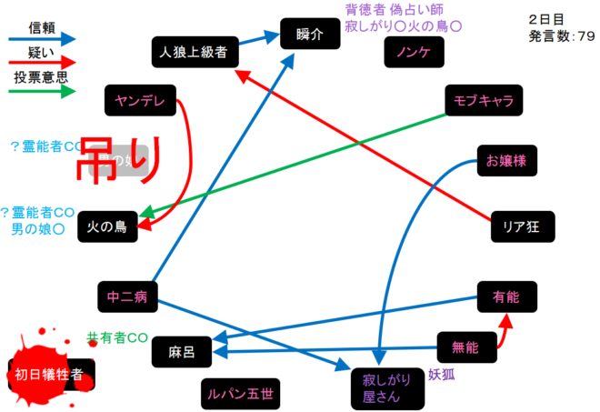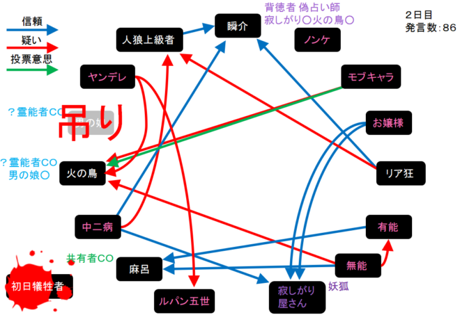 瞬介「火の鳥○の占い結果を作ってきた(上の図)!それでは!こんな無茶苦茶な配役と占い結果の提示は初めてだよ。2日目よ来い来い!そいっ!」