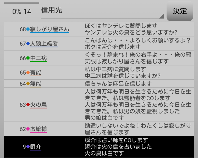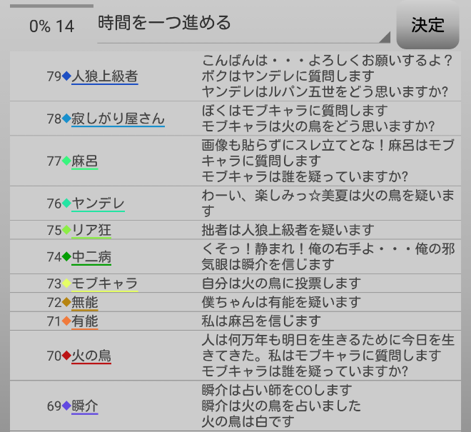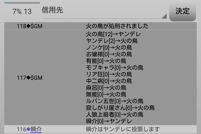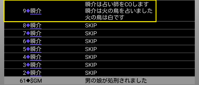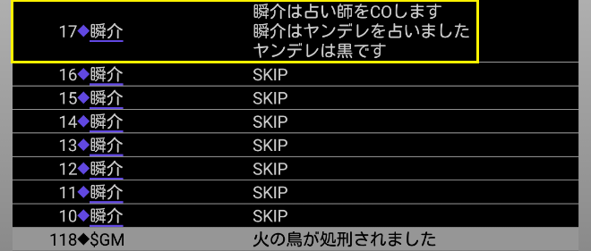 瞬介「火の鳥を占ってグレーの消費を抑えた。今日は火の鳥吊りだからグレーは減らない。そして村人は俺を信頼してくれている。流れは悪くないのだ。信頼関係を築こうぜ。俺は村陣営の『人狼上級者を信頼しています!』」