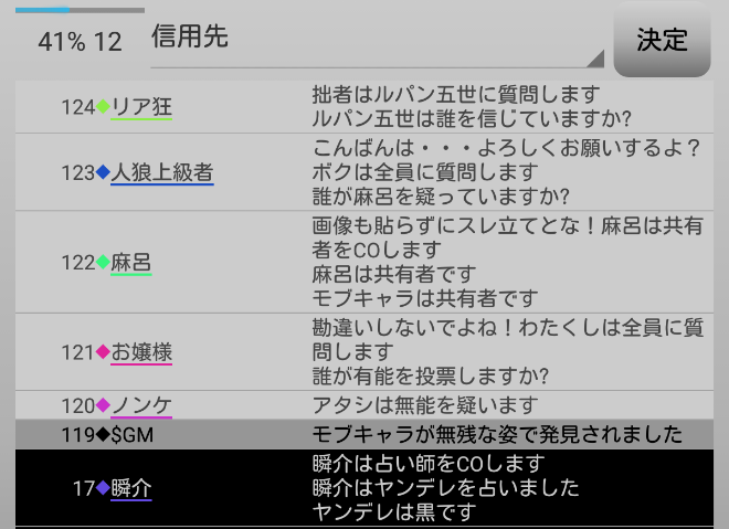 瞬介「無能が疑われているな。無能はグレランで吊ってしまおう。無能、君には妖狐役をしてもらうよ。俺は無能を疑う『リア狂を信頼します!』」