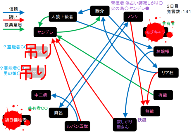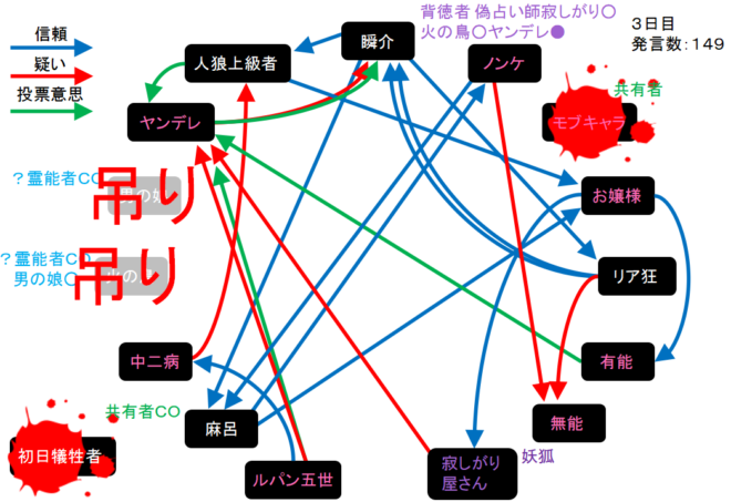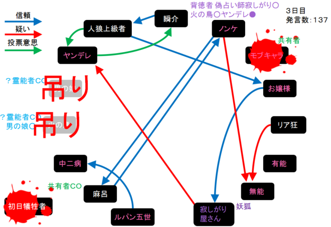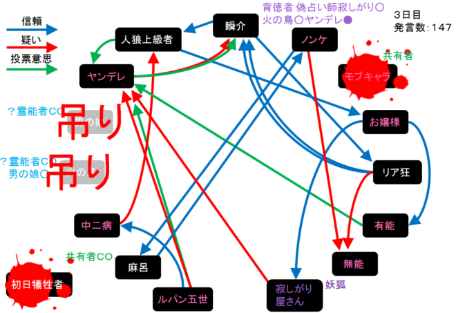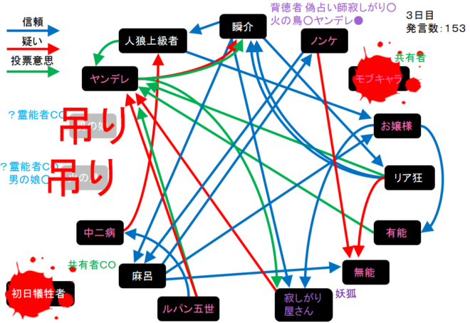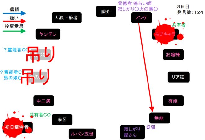 瞬介「ヤンデレ●の占い結果を作ってきた(上の図)!それでは!これでヤンデレが共有者だったら笑ってしまうね。3日目よ来い来い!そいっ!」