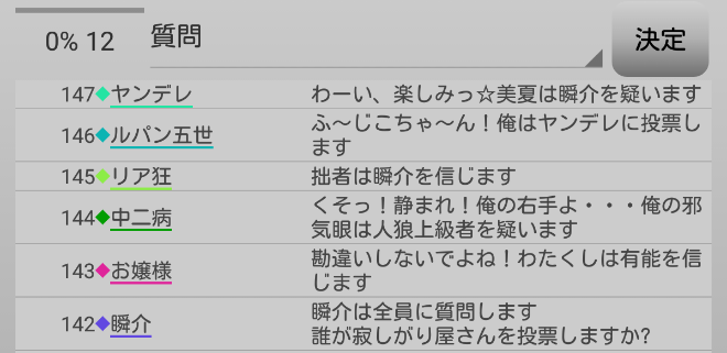 瞬介「人狼(?)のヤンデレを処刑した。他の人狼は誰だか分かりません。明日は村陣営のリア狂に○を飛ばしておくかあ?」