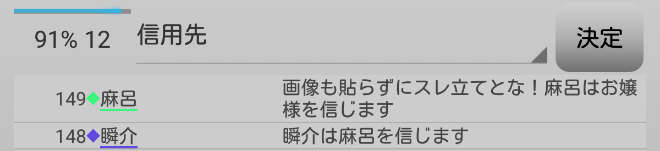 瞬介「人狼がわからーん!人狼候補を信頼できない。疑うこともできないな。共有者に発言をしよう。俺は『麻呂を信頼します!』」