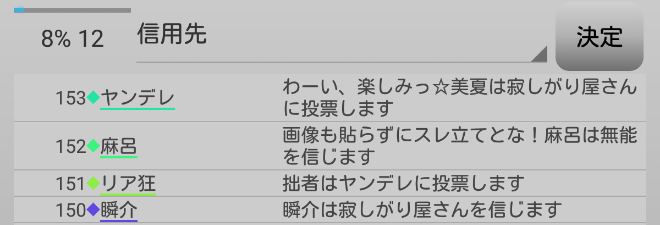 信頼関係を構築しつつヤンデレを疑っておこう。俺は村陣営の『リア狂を信頼します!』。