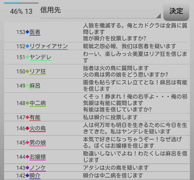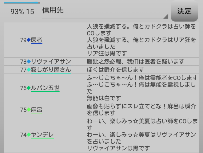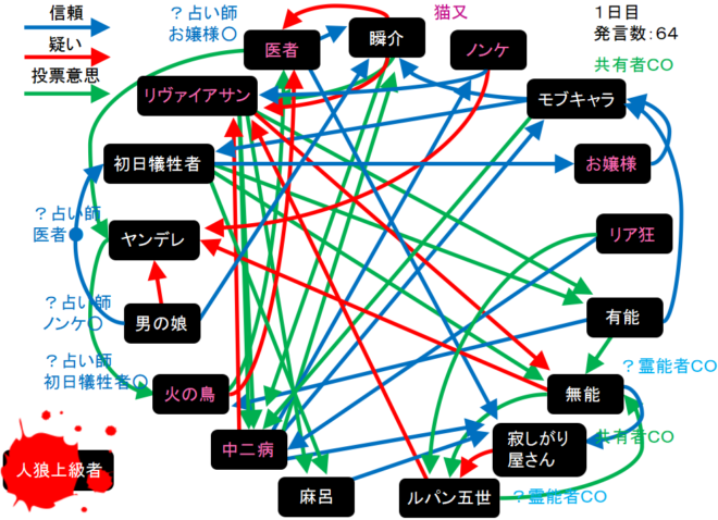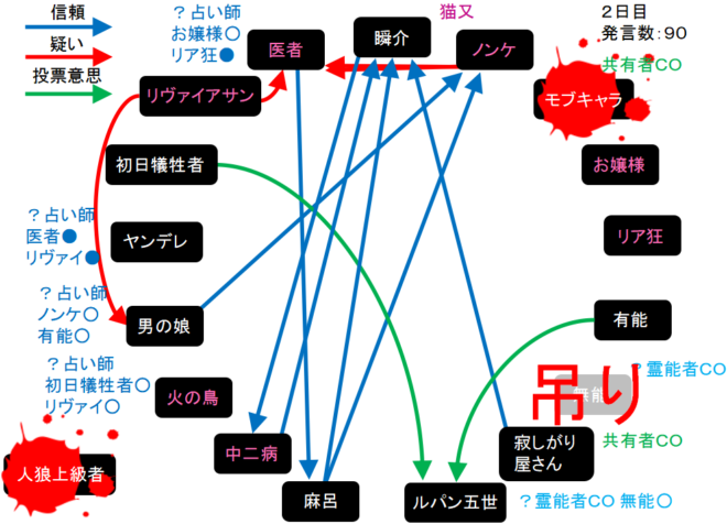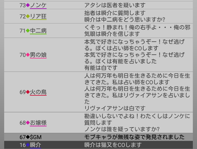占い師が4人もいるからザックリと主観を述べると占い師COのタイミングから医者と火の鳥は人狼だろうヤンデレは真占い師でありリヴァイアサンも人狼だ。有能に○を出した男の娘は妖狐陣営かもしれない(狂信者っぽくない)」