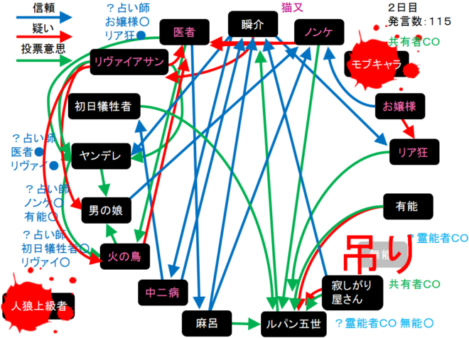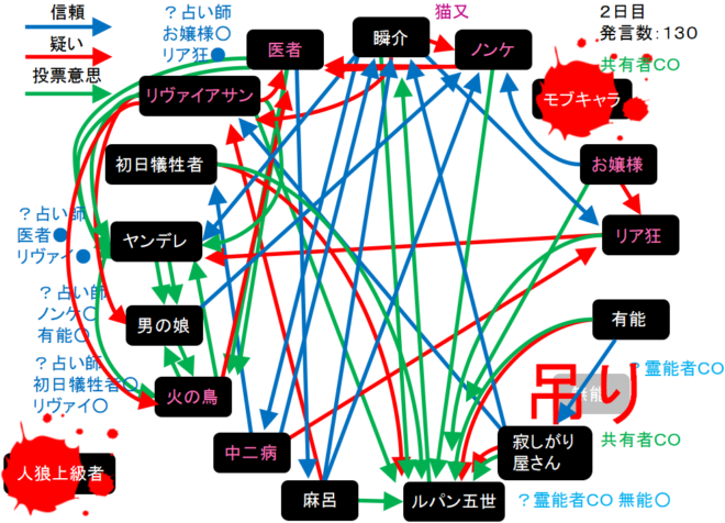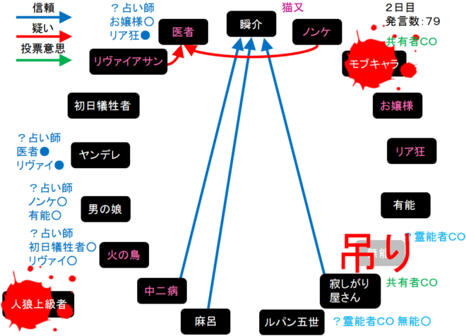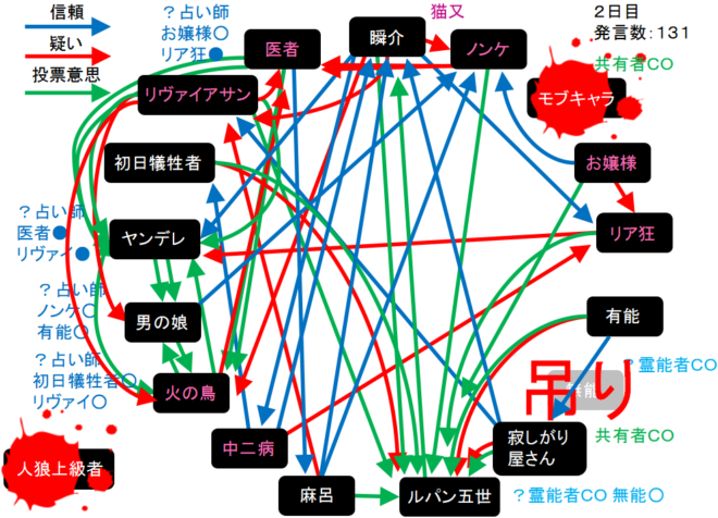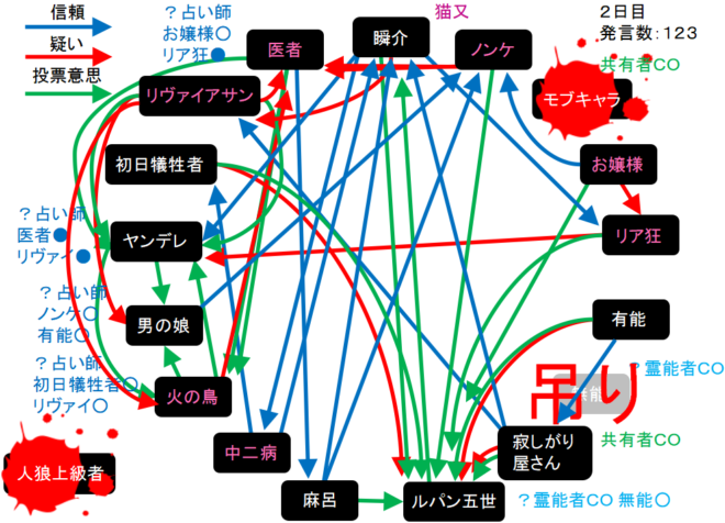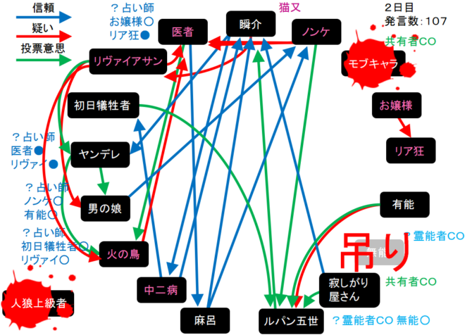 俺を信頼してくれている中二病や麻呂も妖狐かもしれない。仕方ないので、また占い師にケチをつけよう。俺は医者が●を出した『リア狂を信頼します!』。