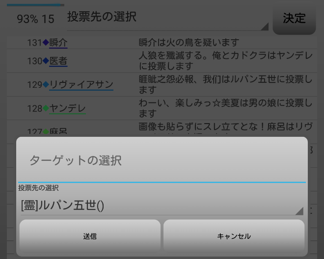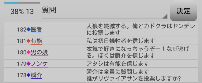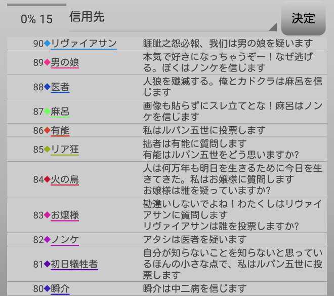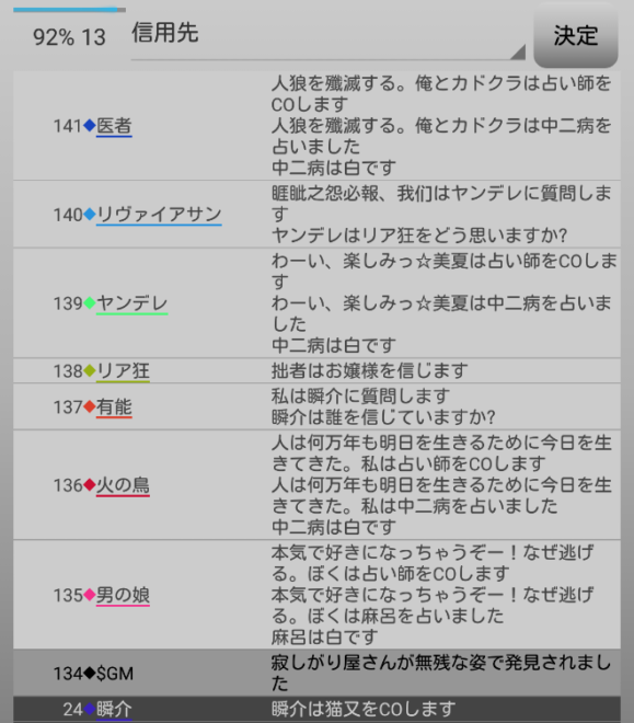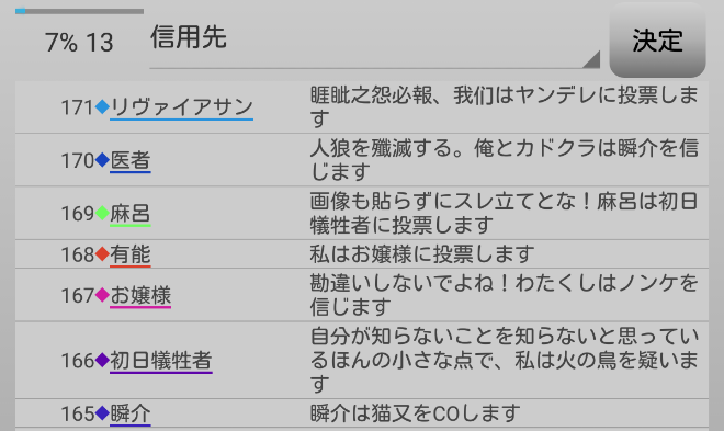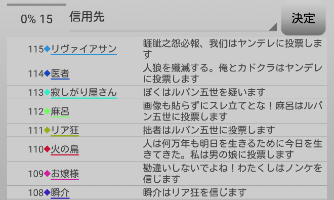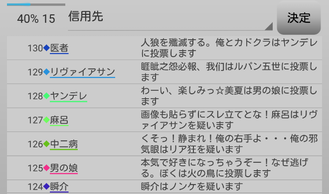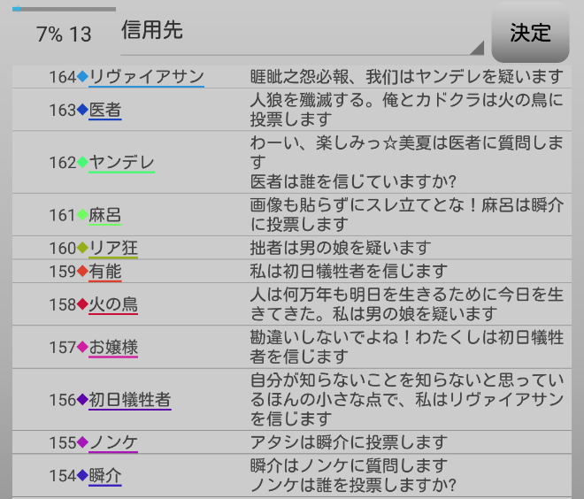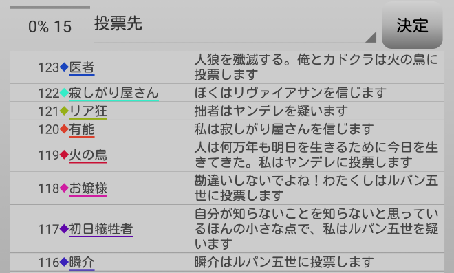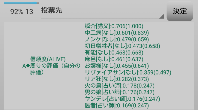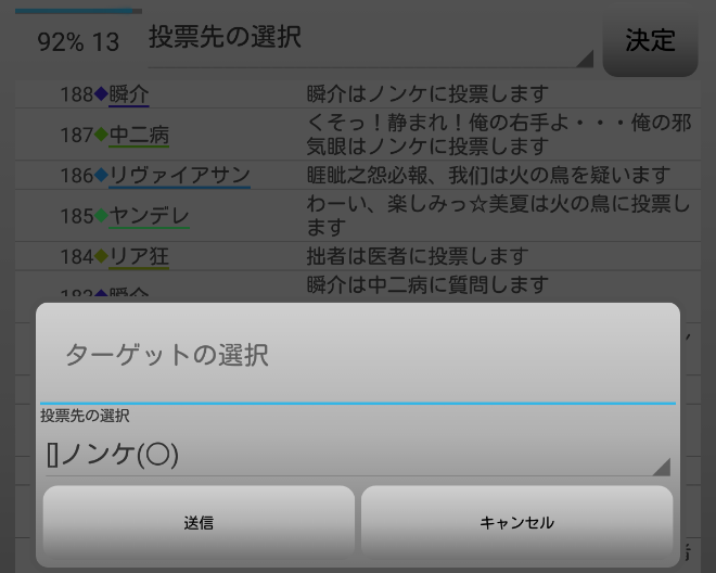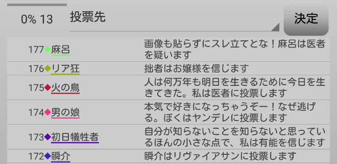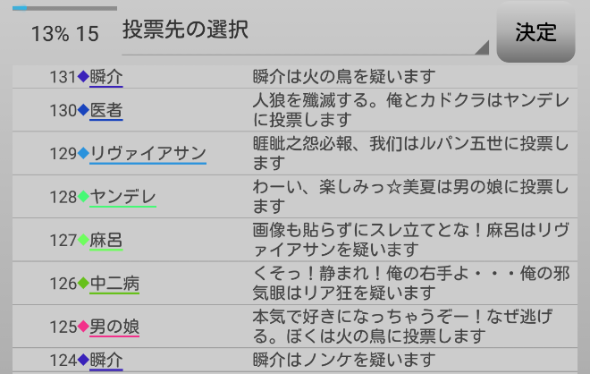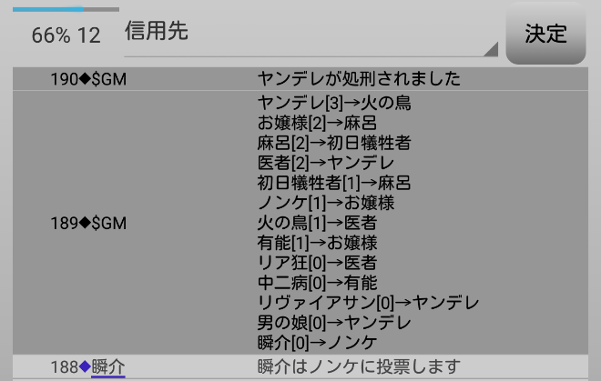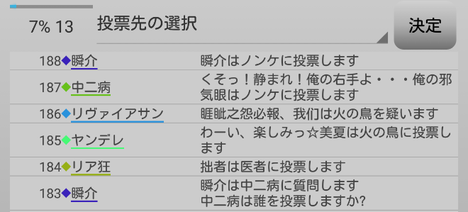 リヴァイアサンなんて放っておいて早めに中二病と一緒に投票先を合わせておけば良かったのかあ。最後の発言になります。俺は信頼度の高い中二病と一緒に『ノンケへ投票をします!』」