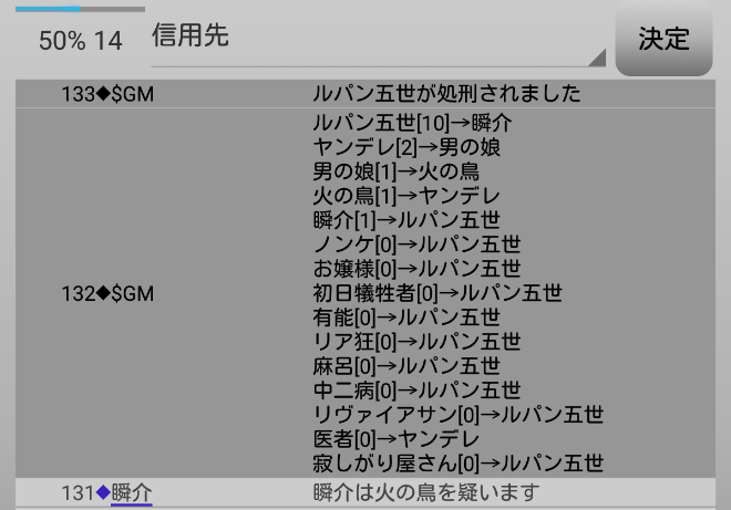 瞬介「議論はこれで終わり。投票の時間になります。矢印が滅茶苦茶だ。投稿を4つ作らなければいけないので雑になっています。今後は見やすく線を引きます。『ルパンに投票』をして霊ロラを終わらせよう」