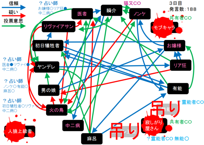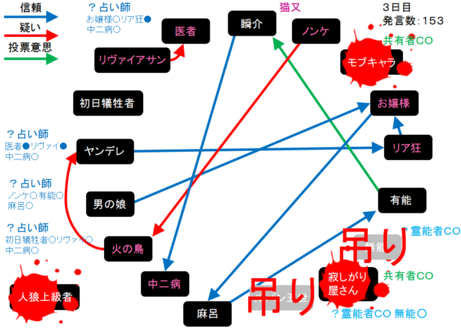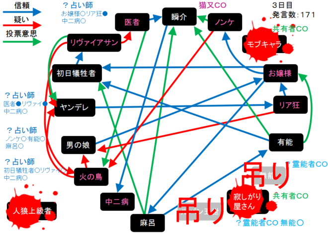 3人の占い師から○を出された中二病は村陣営だろう。このタイミングで○を出された麻呂は妖狐かもしれない。残りのグレー村人は・・・俺だけじゃねえか!