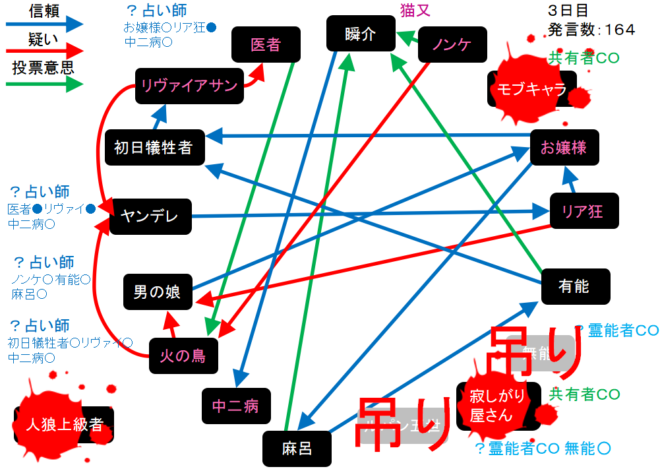 しかも明日の3日目は真占い師(?)のヤンデレがピンチなのである。占い師は4人いるので対抗から3票、ヤンデレが●出しをしたリヴァイアサンから1票入り得票数は最大で4票になる。村人の投票が分散したらヤンデレは処刑されるだろう。