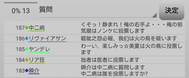 有能から誰を信頼しているか質問が来ているね。共有者が不在となった今、一番信頼するべきは中二病だろう。俺は『中二病を信頼します!』。