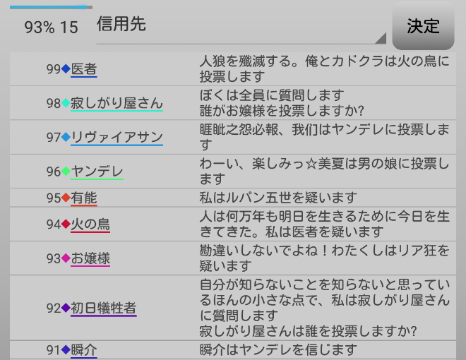 最後の発言になります。火の鳥!お前は人狼だ!俺は『火の鳥を疑います!』。