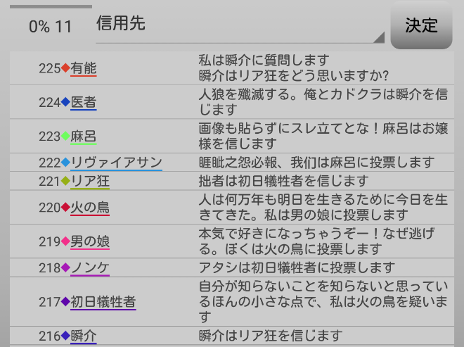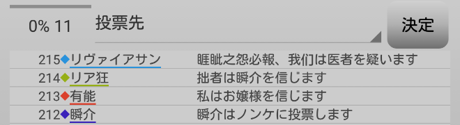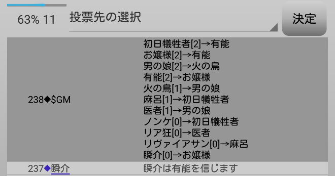 瞬介「もうだめだあ。●を処刑している暇もないなんて。配役に無理があったか?最後の発言になります。俺は『有能を信頼しています!』。有能には投票をしないでください!」
