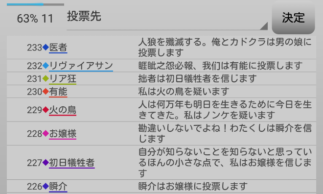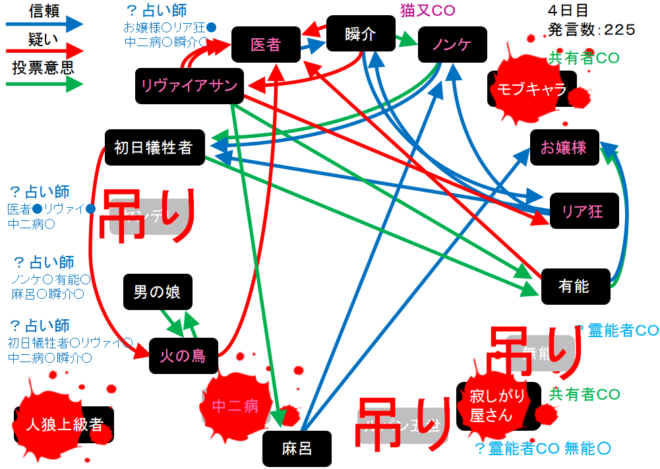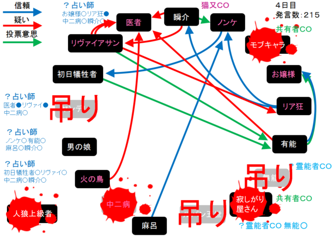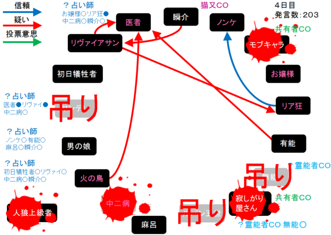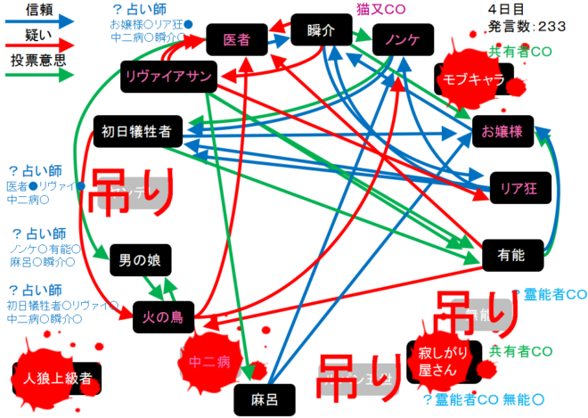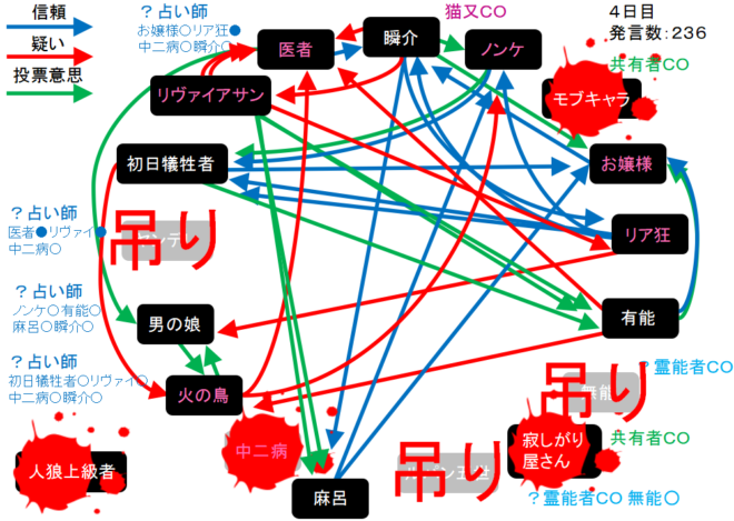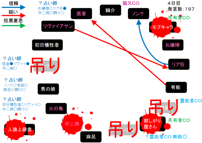早く4日目を迎えよう。吊り回数は5回。まだ人狼(4匹)も妖狐も処刑できていないのだ。