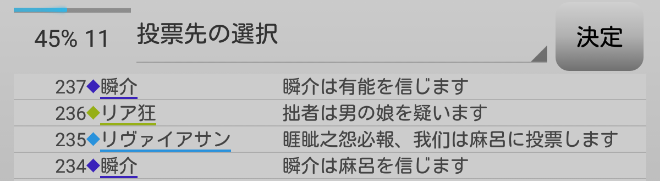 瞬介「リヴァイアサンが強い。●を持っているのに主導権を握るとはどうなっているんだよ。このままでは有能が吊られてしまう」