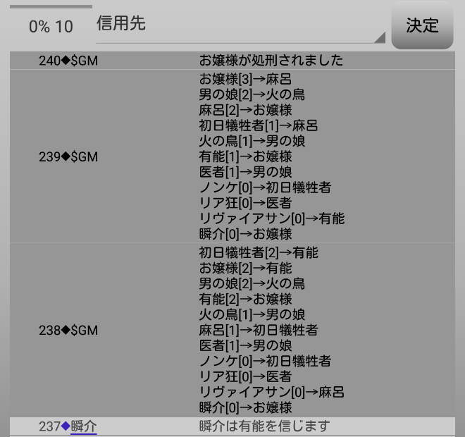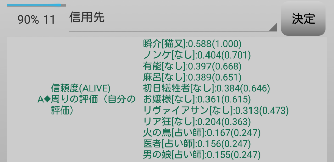 瞬介「残念ながら俺の信頼度は上昇していない(上の図)。値は高いので処刑先を導いてみよう」