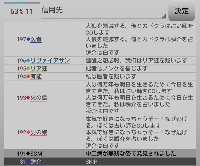 瞬介「今日も○吊りの流れになるのか。占い師に背徳者がいることを期待しているのかな」