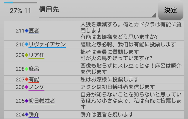有能を信頼しておこう。その前に投票意思を示していない麻呂を信頼だ。おい麻呂!俺に力を貸してくれないか?俺は『麻呂を信頼しています!』。