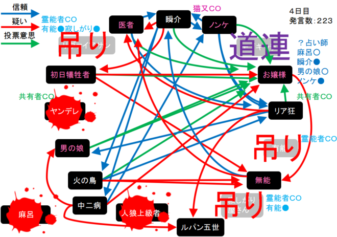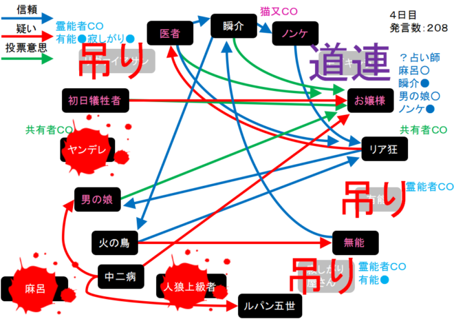 偽占い師のお嬢様(人狼)がノンケ●を出した。仲間の人狼に●を出したりはしないだろう(たぶん)。人狼は『無能、男の娘、初日犠牲者、医者』の中に3匹いる。