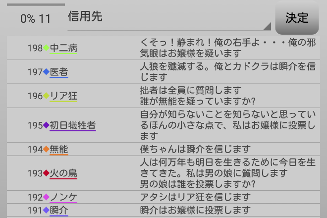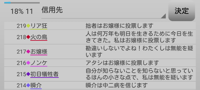 火の鳥が無能を疑っている。人狼候補を疑っているプレイヤーは信頼をしておこう。俺は『火の鳥を信頼します!』。