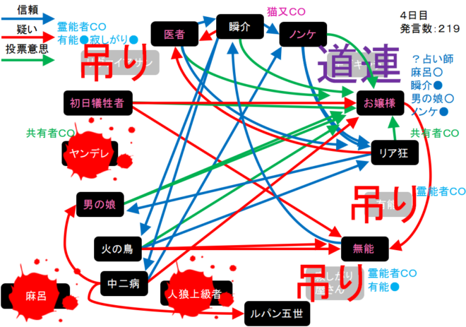 明日はお嬢様の占い結果を無視してランダム処刑を実行するのかな。偽占い結果なのだからノンケ(●持ち)を処刑するのはやめて頂きたい。俺は人狼に●を出された『ノンケを信頼します!』」