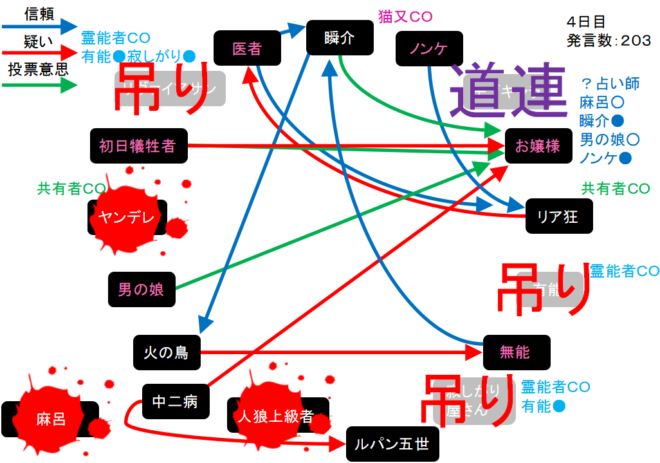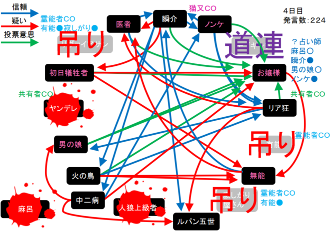 瞬介「リア狂が医者(人狼候補)を疑っている。悪い推理ではないから医者処刑への誘動を試みようか。俺はリア狂と一緒に『医者を疑います!』」