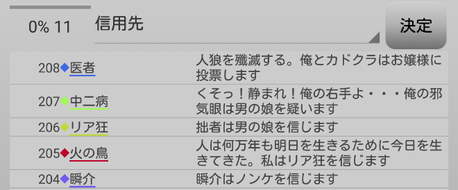 俺の信頼度は村で最大値だろう。明日の議論で人狼候補に投票を集めたいから疑っておこう。俺は『初日犠牲者を疑います!』」