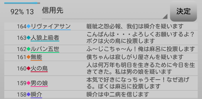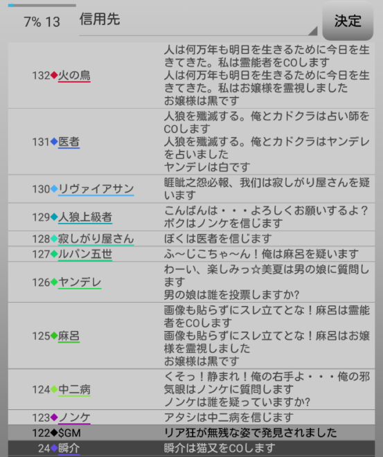 瞬介「信頼発言で怪しいのは右側が妖狐だと仮定して、『ノンケ→男の娘』、『リア狂→無能』、『リヴァイアサン→火の鳥』、こんなものか」