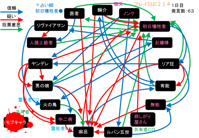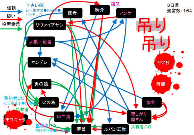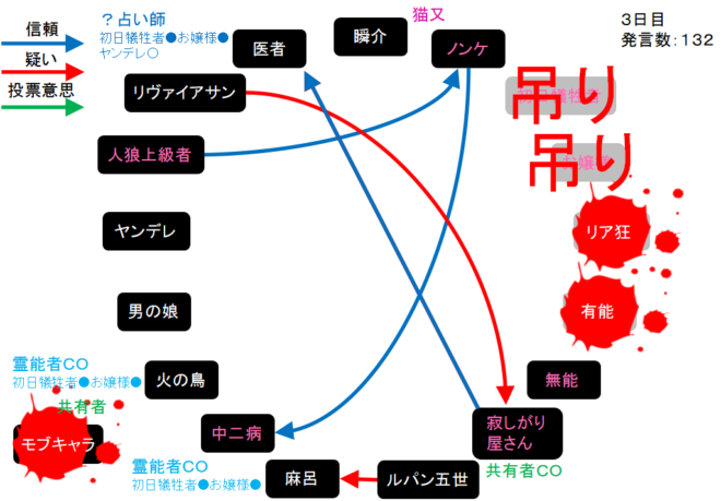 瞬介「3日目は『中二病→ノンケ』、『人狼上級者→ノンケ』が怪しいかな」