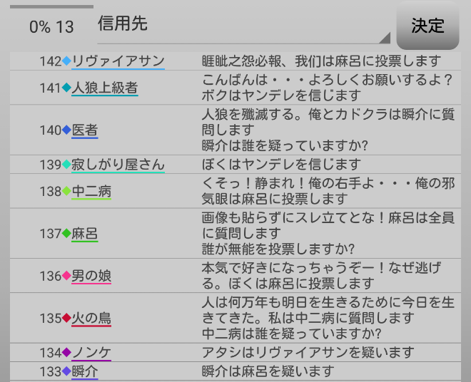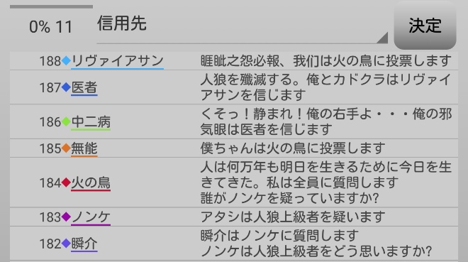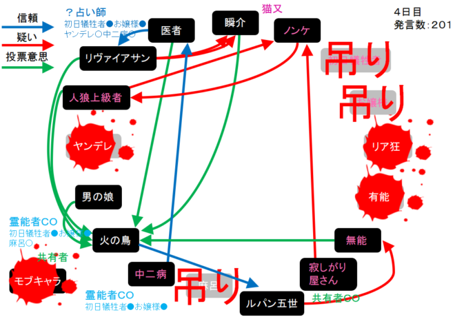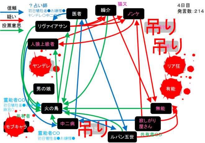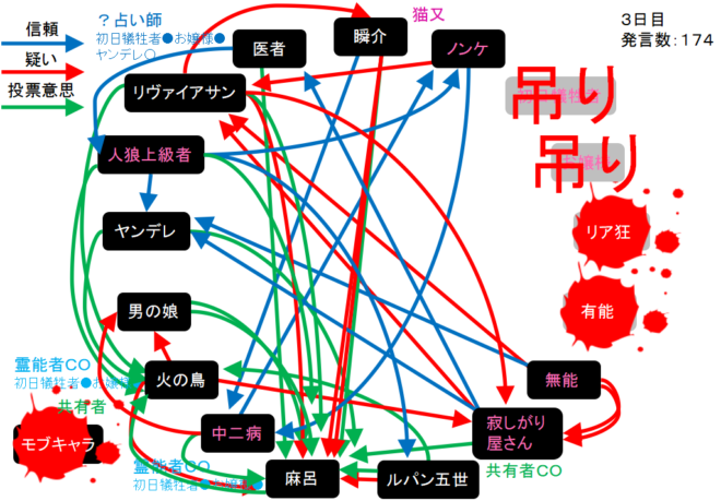 残念なことに信頼発言を追っても人狼の状態がわからん(笑)。ただ2日目に信頼を集めていた人狼上級者、3日目に信頼されていたノンケが怪しいのかなあ?とは思う。
