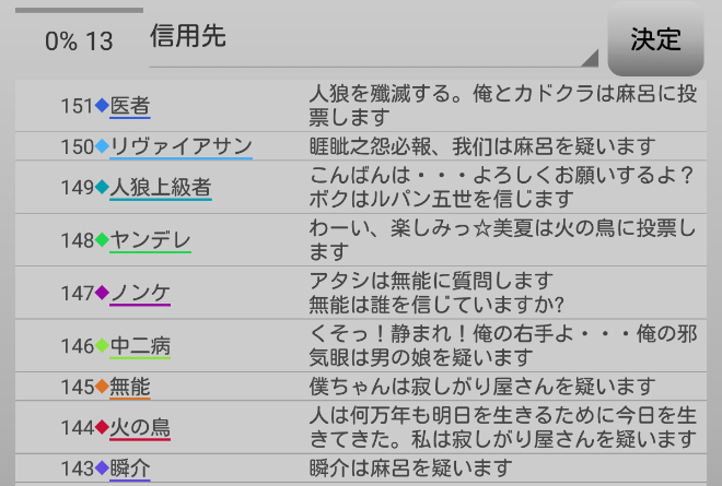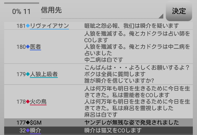 瞬介「妖狐候補を考えたい。過去の発言表を見て背徳者に信頼された妖狐がいないか確かめてみよう」