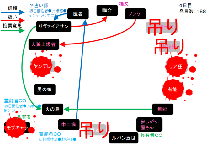 リヴァイアサンが俺を疑って、そのリヴァイアサンを医者が信頼した。明日、グレランになったら俺が投票対象になるかもしれない。妖狐なんて探している余裕はあるのか?