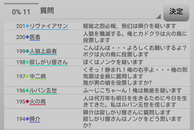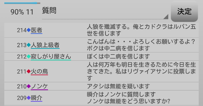 質問は何回もできない。次は人狼を見つけるために質問をしてみよう。沈黙している『寂しがり屋さんはノンケをどう思いますか?』。