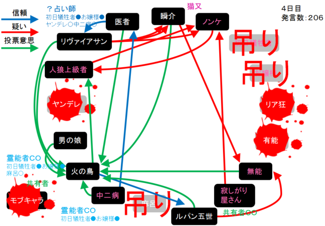 人狼の噛み先は○を持っていたヤンデレ。吊り回数は最大で5回(?)になった。残りのグレーは『俺、ノンケ、無能、寂しがり屋さん、男の娘、人狼上級者』の6名となる。